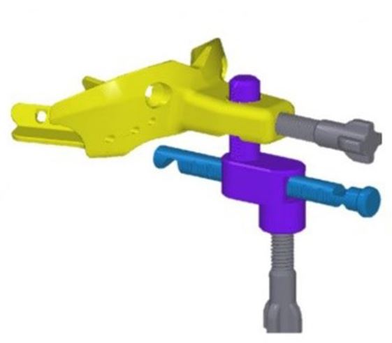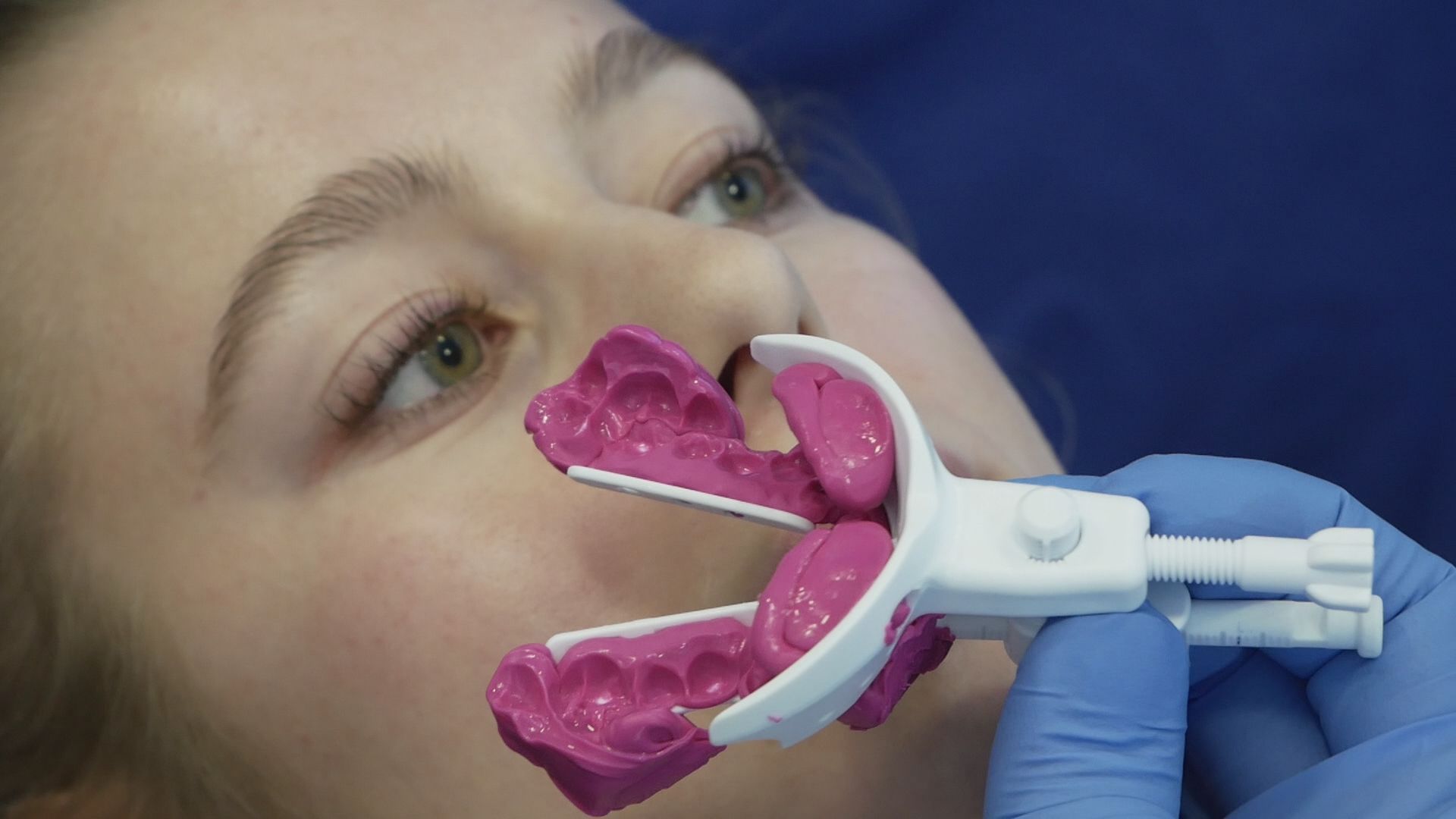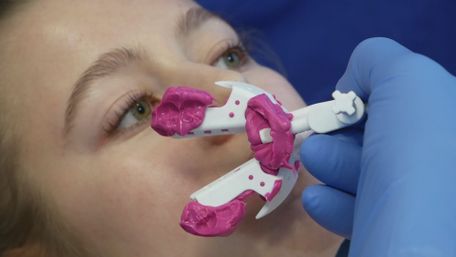 Nach Auftragen von Abdruckmaterial (A-Silikonen) auf die seitlichen Flügelinnenbereiche des Bissgabelkörpers wird die JS-Gauge® im Mund auf die Oberkieferzähne symmetrisch aufgesetzt. Während des Zubeißens der Patientin / des Patienten wird zusätzlich Abdruckmaterial mit der Dosierpistole über die vorderen Einfüllöcher zwischen Bissgabelkörper und Oberkiefer eingefüllt. Nach Aushärtung des Abdruckmaterial ist die JS-Gauge® für die 3D-Justierung der Startprotrusionsposition in liegender Behandlungsposition arbeitsstabil am Oberkiefer fixiert.